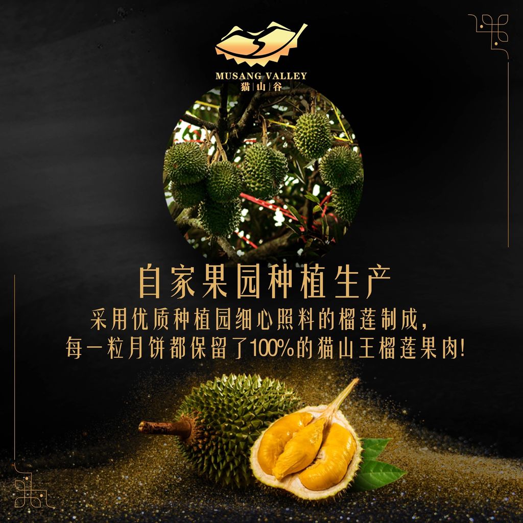 Our mooncakes uses 100% fresh Musang King durian pulps produced by Musang Valley Plantation, with advanced technology to retain the flavor and freshness of the fruit as much as possible.